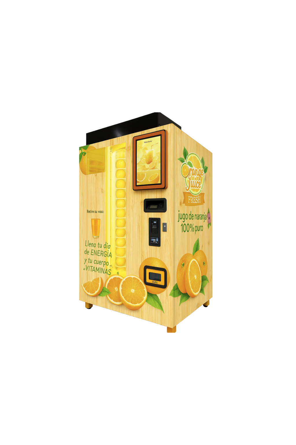 Der VO-001 presst frisch gekühlte Orangen direkt vor den Augen der Kunden – hygienisch, effizient und vollkommen automatisch. Mit Platz für bis zu 335 Orangen und integriertem Reinigungssystem eignet sich dieser Automat ideal für Bahnhöfe, Hotels, Supermärkte oder Fitnessstudios, die auf gesunde Frische setzen.